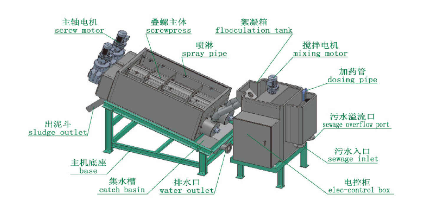疊螺污泥脫水機(jī)由疊螺體、驅(qū)動(dòng)裝置、濾液槽、混合系統(tǒng)、架體等組成。疊螺污泥脫水機(jī)工作時(shí),通過污泥泵將污泥提升至混合槽后,此時(shí),加藥泵也定量地對混合槽輸送藥液,攪拌電機(jī)帶動(dòng)整個(gè)攪拌系統(tǒng)將污泥與藥液進(jìn)行充分混合,從而產(chǎn)生礬花,當(dāng)液位達(dá)到液位傳感器上位時(shí),此時(shí)液位傳感器得到信號,使得疊螺主體電機(jī)工作,從而開始壓濾流入至疊螺主體內(nèi)污泥,在螺旋軸的作用下,將污泥一步一步提升至污泥出口,濾液則從固定環(huán)和游動(dòng)環(huán)之間的間隙中流出來。